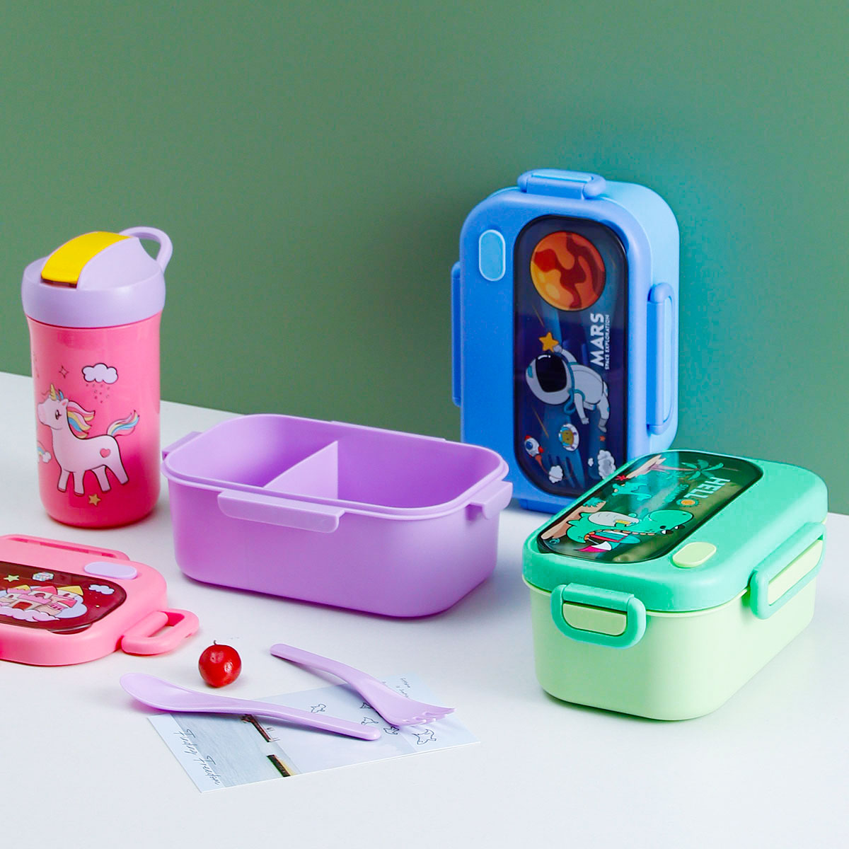 趣悅卡通長方單層/分格飯盒+翻蓋吸嘴/旋蓋運動/翻蓋運動水壺