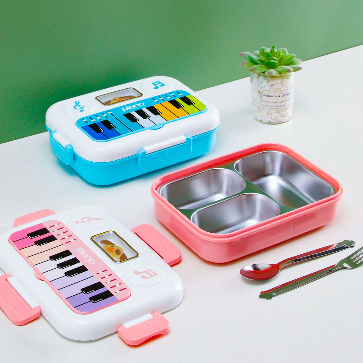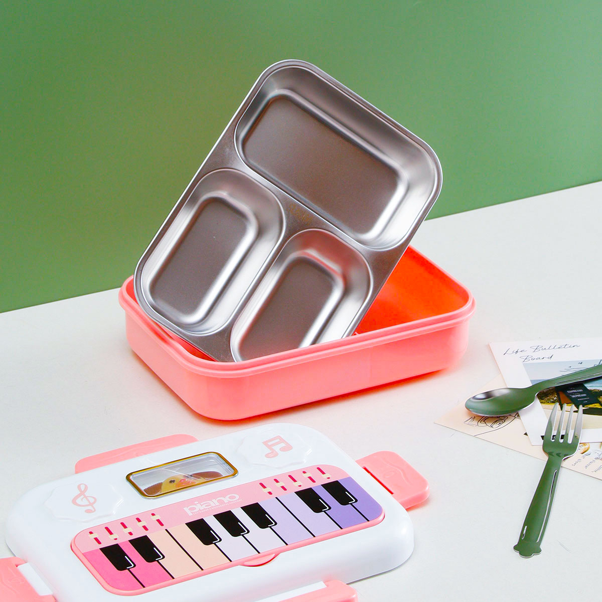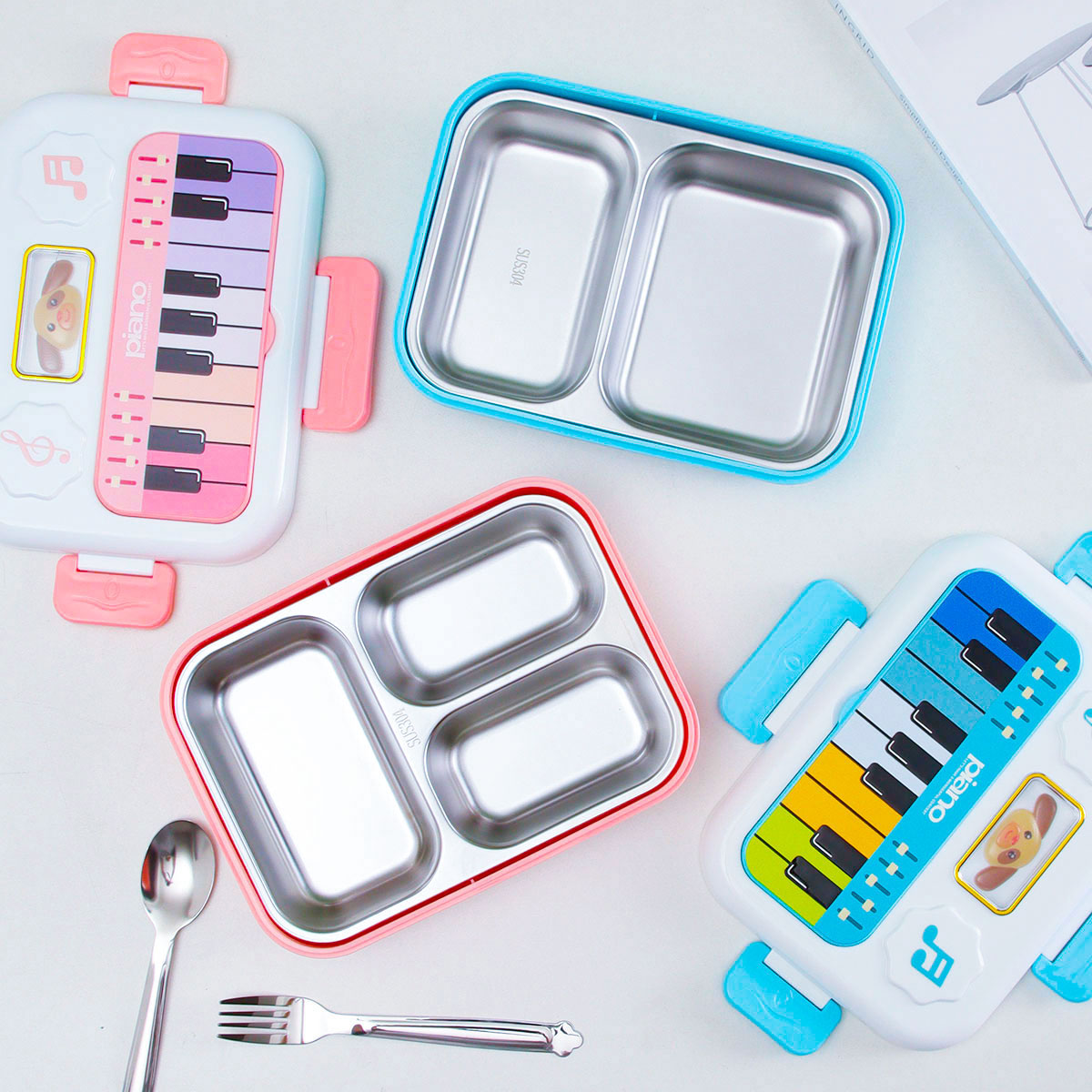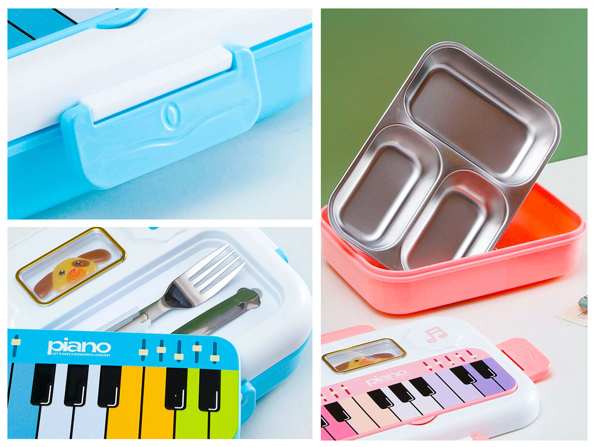 小鋼琴二格/三格不銹鋼飯盒(不銹鋼叉匙)
