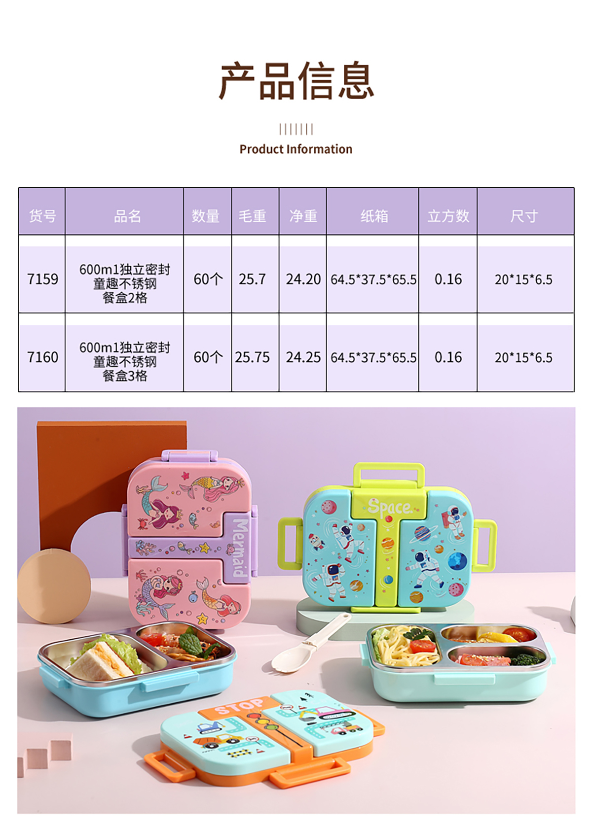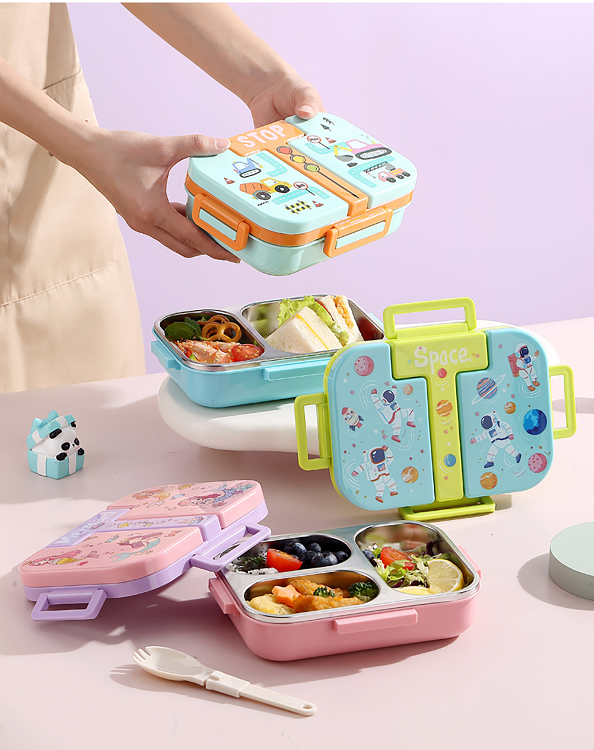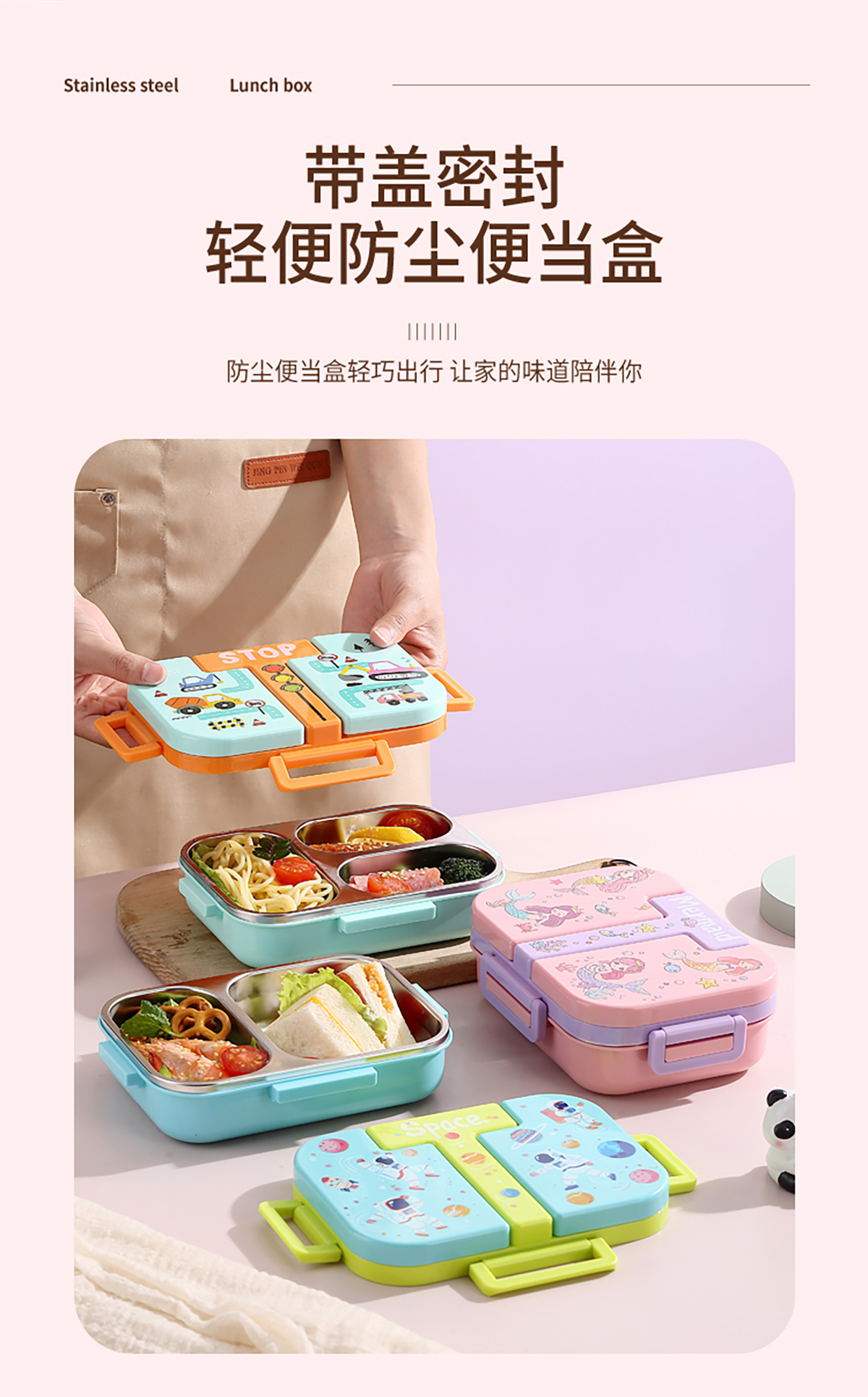 600ml 獨(dú)立密封童趣不銹鋼餐盒2格/3格 (配PP折疊湯勺)