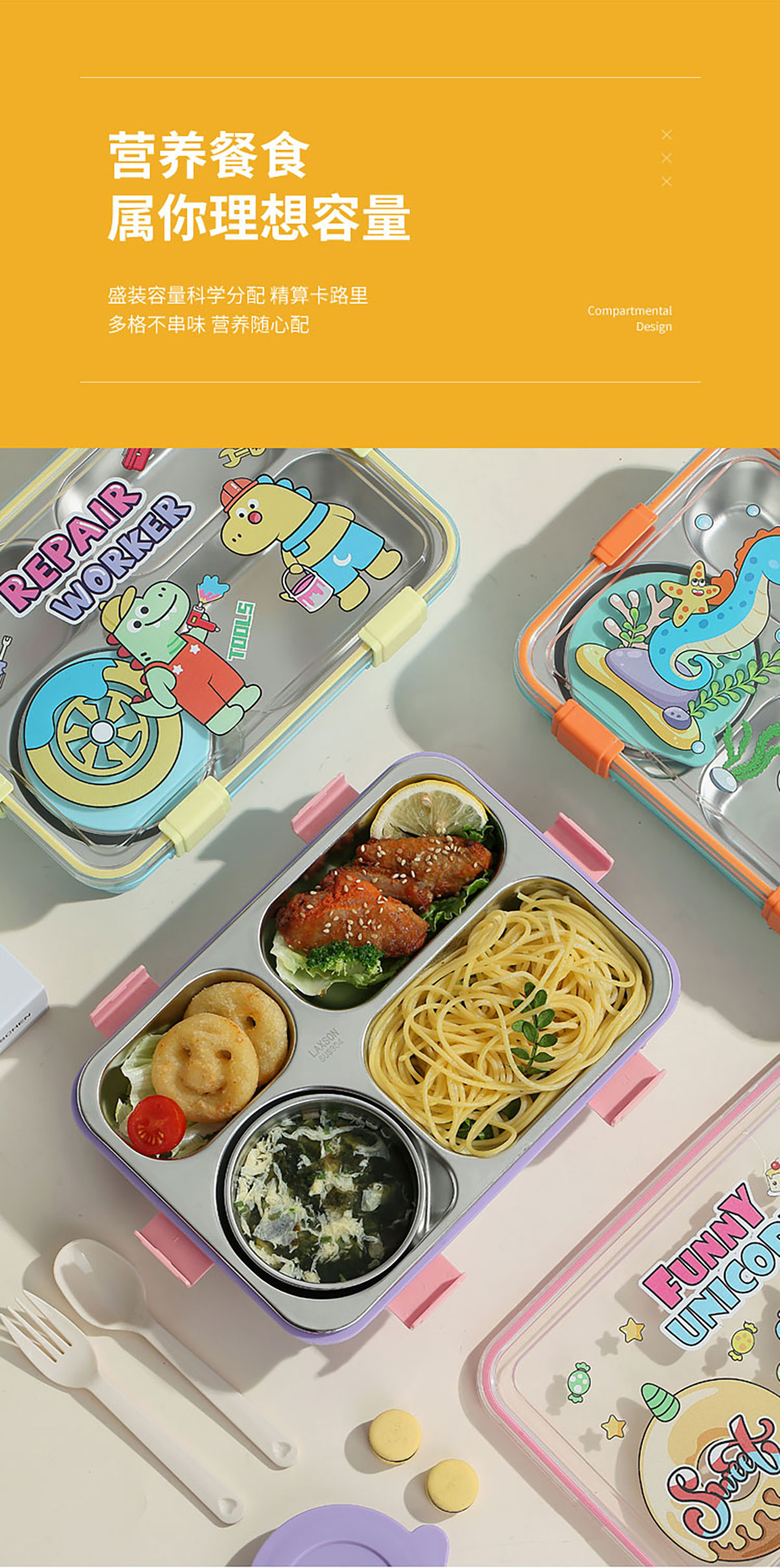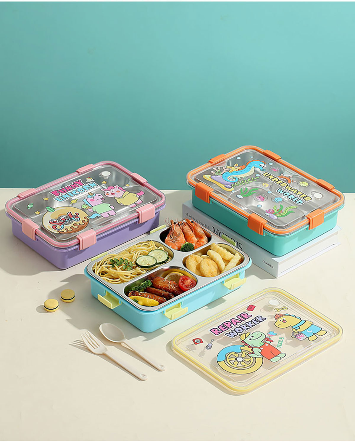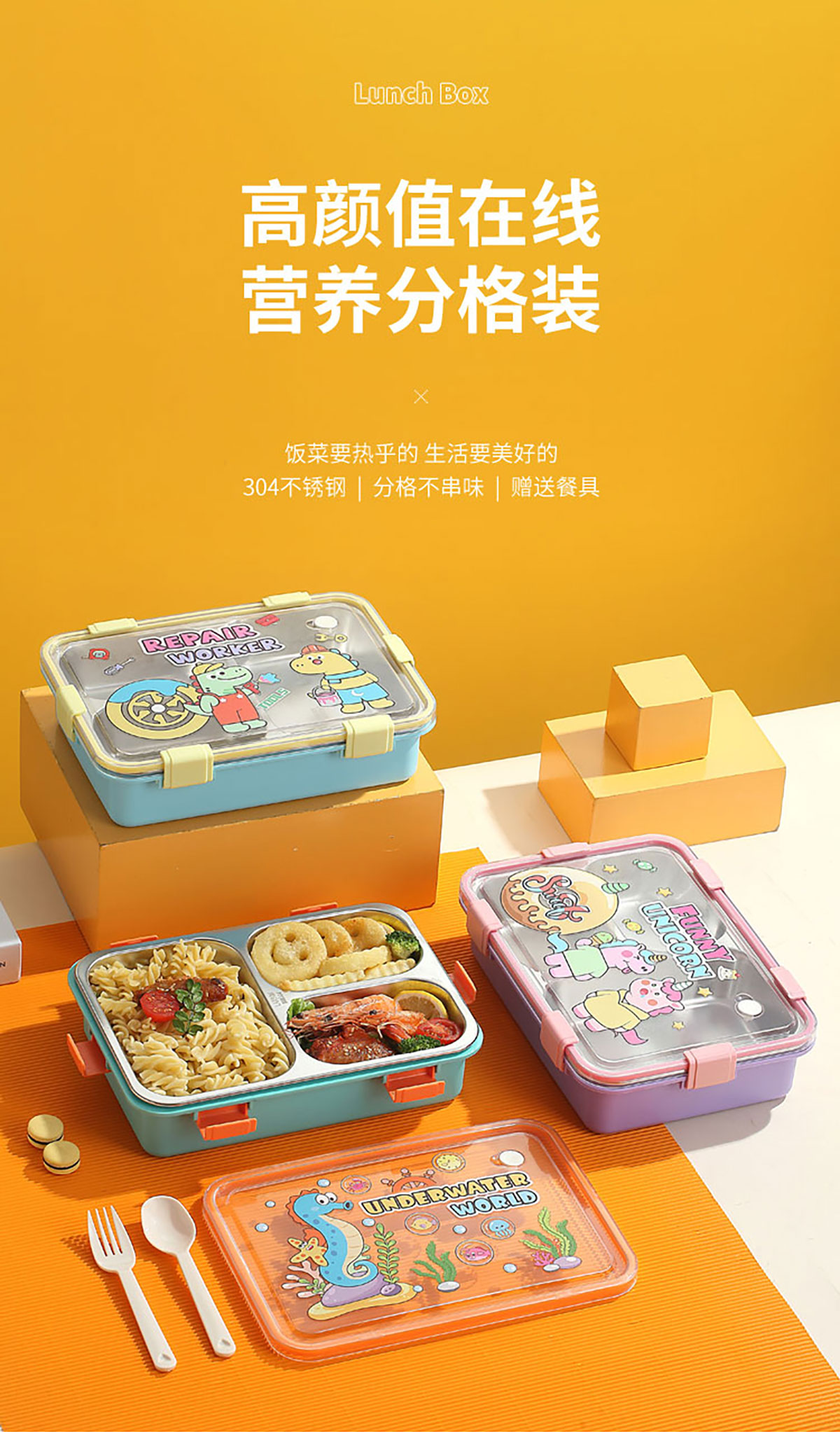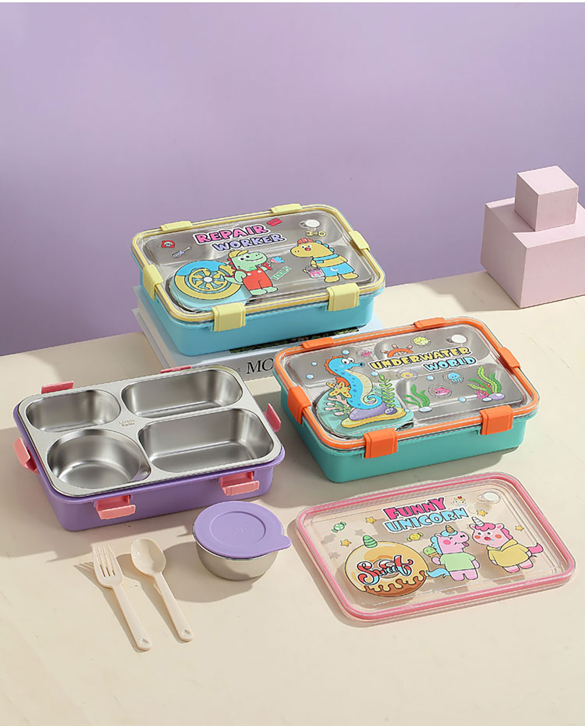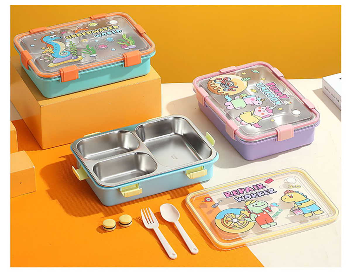 UV 卡通不銹鋼餐盒三格/四格/四格帶碗(配PP叉子和湯勺)