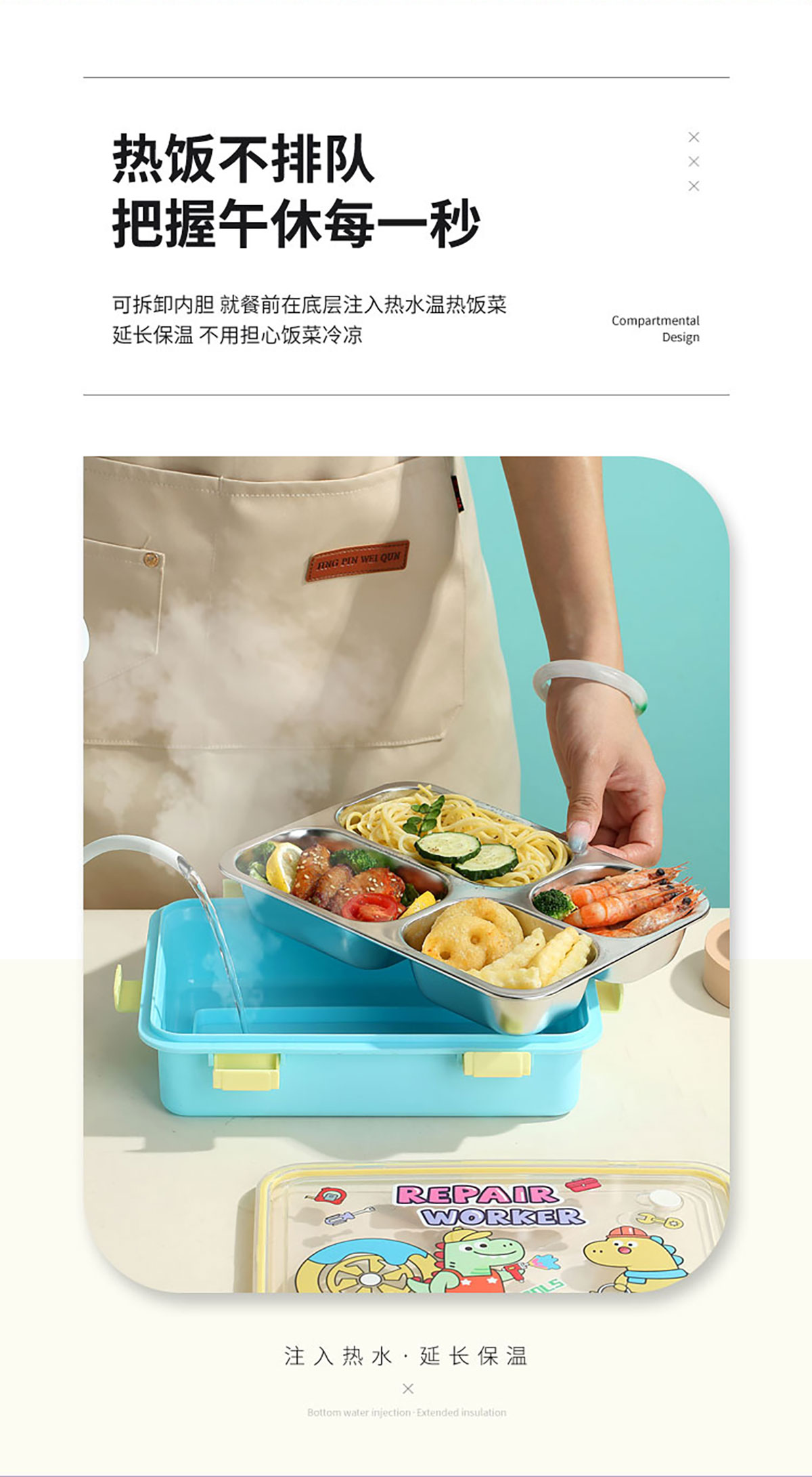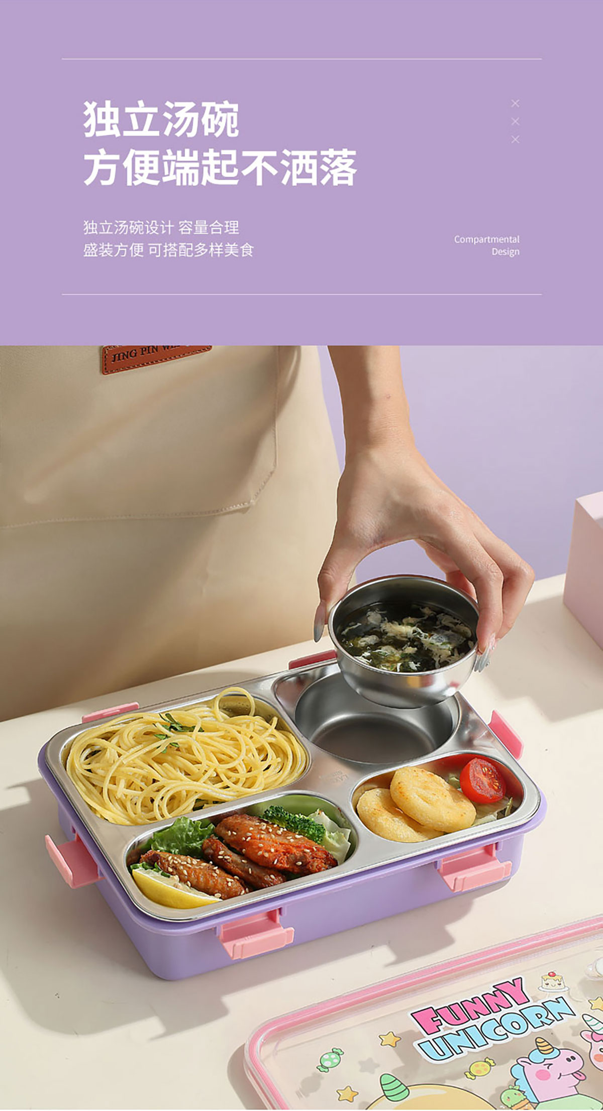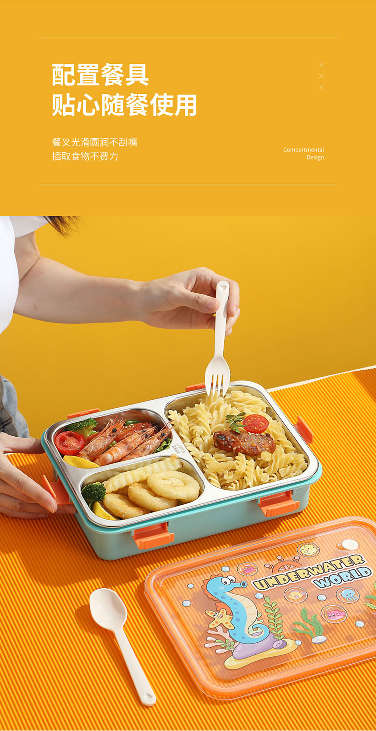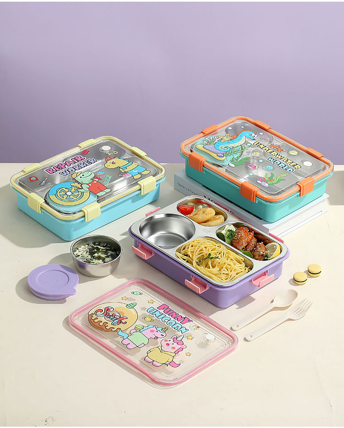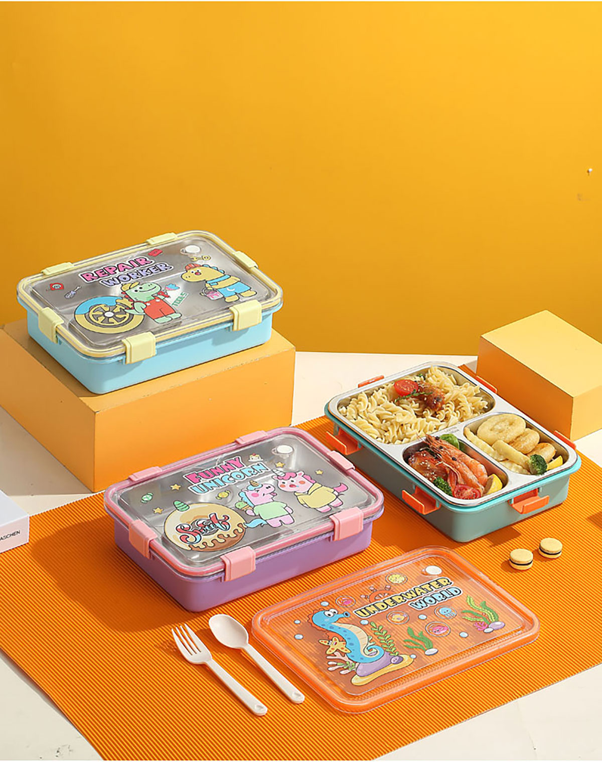 UV 卡通不銹鋼餐盒三格/四格/四格帶碗(配PP叉子和湯勺)